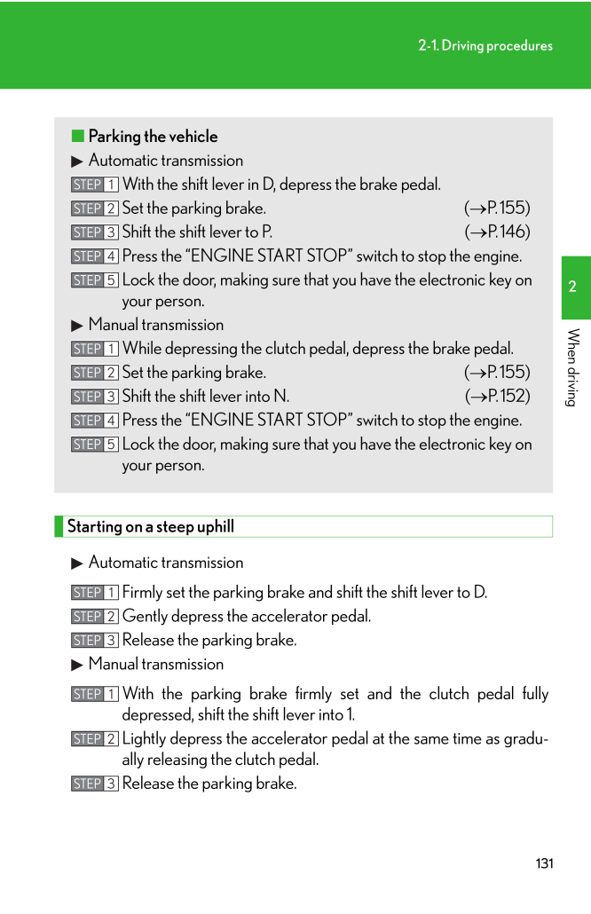 1312-1. Driving procedures2When drivingStarting on a steep uphillAutomatic transmissionFirmly set the parking brake and shift the shift lever to D. Gently depress the accelerator pedal. Release the parking brake. Manual transmissionWith the parking brake firmly set and the clutch pedal fullydepressed, shift the shift lever into 1. Lightly depress the accelerator pedal at the same time as gradu-ally releasing the clutch pedal. Release the parking brake. ■Parking the vehicleAutomatic transmissionWith the shift lever in D, depress the brake pedal. Set the parking brake. (→P. 155) Shift the shift lever to P. (→P. 146) Press the "ENGINE START STOP" switch to stop the engine.Lock the door, making sure that you have the electronic key onyour person.Manual transmissionWhile depressing the clutch pedal, depress the brake pedal. Set the parking brake. (→P. 155) Shift the shift lever into N. (→P. 152) Press the "ENGINE START STOP" switch to stop the engine.Lock the door, making sure that you have the electronic key onyour person.STEP 1STEP 2STEP 3STEP 4STEP 5STEP 1STEP 2STEP 3STEP 4STEP 5STEP 1STEP 2STEP 3STEP 1STEP 2STEP 3