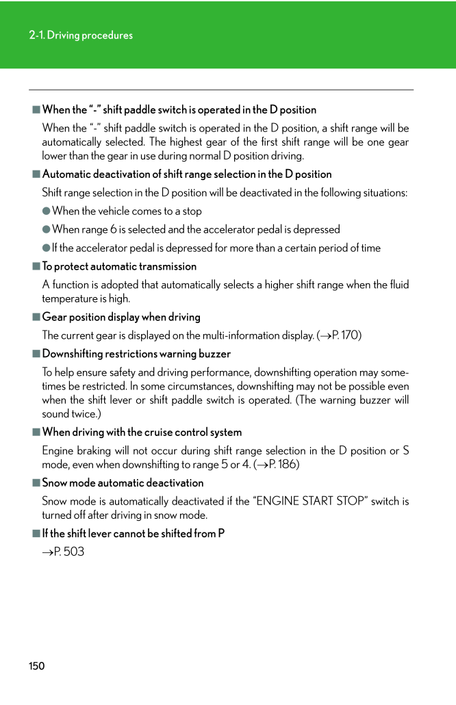 1502-1. Driving procedures■When the "-" shift paddle switch is operated in the D positionWhen the "-" shift paddle switch is operat ed in the D position, a shift range will beautomatically selected. The highest gear of the first shift range will be one gearlower than the gear in use during normal D position driving.■Automatic deactivation of shift range selection in the D positionShift range selection in the D position will be deactivated in the following situations:●When the vehicle comes to a stop●When range 6 is selected and the accelerator pedal is depressed●If the accelerator pedal is depressed for more than a certain period of time■To protect automatic transmissionA function is adopted that automatically se lects a higher shift range when the fluidtemperature is high.■Gear position display when drivingThe current gear is displayed on the multi-information display. ( →P. 170)■Downshifting restrictions warning buzzerTo help ensure safety and driving perfor mance, downshifting operation may some-times be restricted. In some circumstance s, downshifting may not be possible evenwhen the shift lever or shift paddle switch is operated. (The warning buzzer willsound twice.) ■When driving with the cruise control systemEngine braking will not occur during shif t range selection in the D position or Smode, even when downshifting to range 5 or 4. ( →P. 186)■Snow mode automatic deactivationSnow mode is automatically deactivated if the "ENGINE START STOP" switch isturned off after driving in snow mode. ■If the shift lever cannot be shifted from P→P. 503
