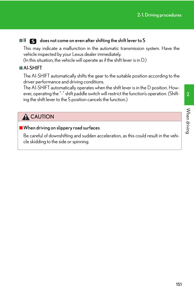 1512-1. Driving procedures2When driving■If does not come on even after shifting the shift lever to SThis may indicate a malfunction in the automatic transmission system. Have thevehicle inspected by your Lexus dealer immediately. (In this situation, the vehicle will operate as if the shift lever is in D.)■AI-SHIFTThe AI-SHIFT automatically shifts the gear to the suitable position according to thedriver performance and driving conditions.The AI-SHIFT automatically operates when the shift lever is in the D position. How-ever, operating the "-" shift paddle switch will restrict the function's operation. (Shift-ing the shift lever to the S position cancels the function.)CAUTION■When driving on slippery road surfacesBe careful of downshifting and sudden accele ration, as this could result in the vehi-cle skidding to the side or spinning.