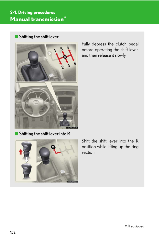 1522-1. Driving proceduresManual transmission∗■Shifting the shift leverFully depress the clutch pedalbefore operating the shift lever,and then release it slowly.■Shifting the shift lever into RShift the shift lever into the Rposition while lifting up the ringsection. ∗: If equipped
