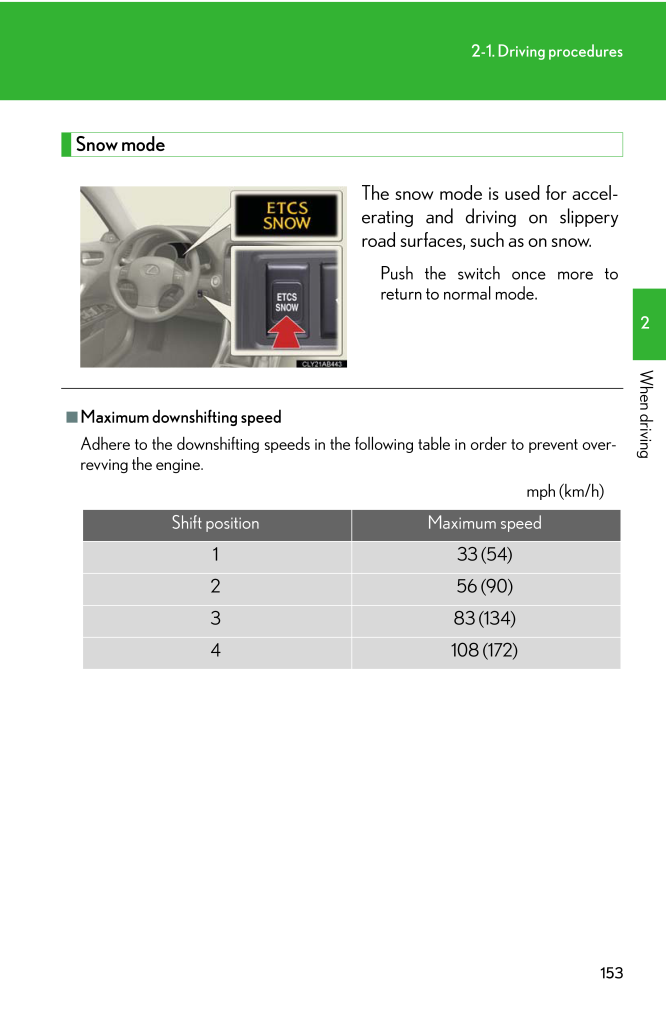 1532-1. Driving procedures2When drivingSnow modeThe snow mode is used for accel-erating and driving on slipperyroad surfaces, such as on snow. Push the switch once more toreturn to normal mode. ■Maximum downshifting speedAdhere to the downshifting speeds in the following table in order to prevent over-revving the engine. mph (km/h)Shift position Maximum speed1 33 (54)2 56 (90)3 83 (134)4 108 (172)