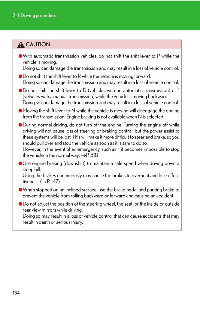 1342-1. Driving proceduresCAUTION●With automatic transmission vehicles, do not shift the shift lever to P while thevehicle is moving.Doing so can damage the transmission and may result in a loss of vehicle control.●Do not shift the shift lever to R while the vehicle is moving forward.Doing so can damage the transmission and may result in a loss of vehicle control.●Do not shift the shift lever to D (vehicle s with an automatic transmission) or 1(vehicles with a manual transmission) while the vehicle is moving backward.Doing so can damage the transmission and may result in a loss of vehicle control.●Moving the shift lever to N while the vehicle is moving will disengage the enginefrom the transmission. Engine braking is not available when N is selected.●During normal driving, do not turn off the engine. Turning the engine off whiledriving will not cause loss of steering or braking control, but the power assist tothese systems will be lost. This will make it more difficult to steer and brake, so youshould pull over and stop the vehicle as soon as it is safe to do so.However, in the event of an emergency, such as if it becomes impossible to stopthe vehicle in the normal way: →P. 518●Use engine braking (downshift) to maintain a safe speed when driving down asteep hill. Using the brakes continuously may cause the brakes to overheat and lose effec-tiveness. (→P. 147)●When stopped on an inclined surface, use the brake pedal and parking brake toprevent the vehicle from rolling backward or forward and causing an accident. ●Do not adjust the position of the steering wheel, the seat, or the inside or outsiderear view mirrors while driving.Doing so may result in a loss of vehicle control that can cause accidents that mayresult in death or serious injury.