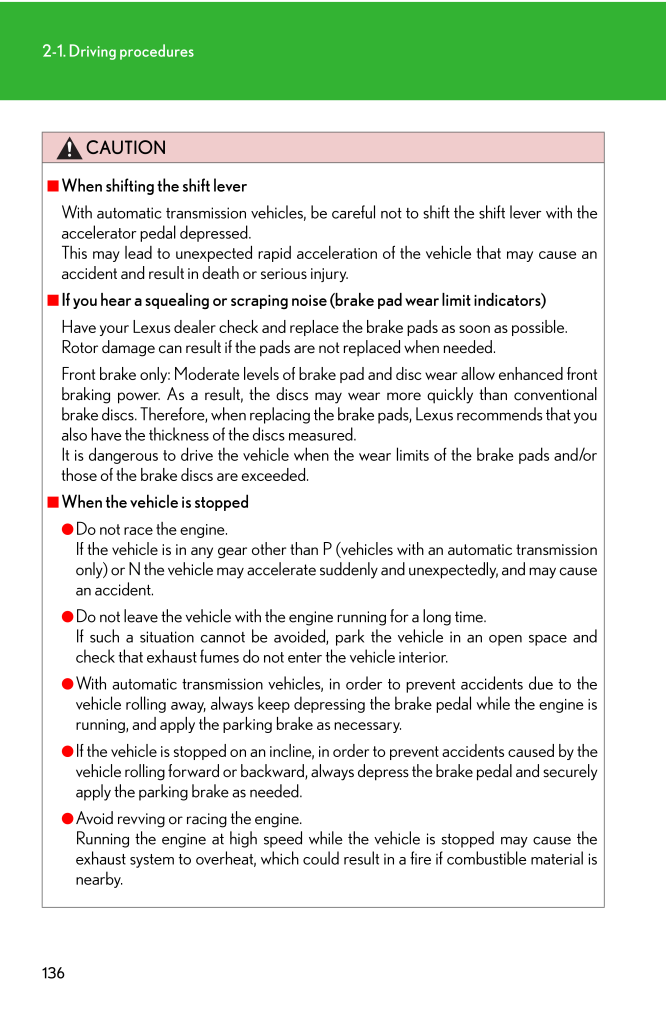 1362-1. Driving proceduresCAUTION■When shifting the shift leverWith automatic transmission vehicles, be car eful not to shift the shift lever with theaccelerator pedal depressed.This may lead to unexpected rapid acceleration of the vehicle that may cause anaccident and result in death or serious injury.■If you hear a squealing or scraping no ise (brake pad wear limit indicators)Have your Lexus dealer check and replac e the brake pads as soon as possible.Rotor damage can result if the pads are not replaced when needed. Front brake only: Moderate levels of brake pad and disc wear allow enhanced frontbraking power. As a result, the discs may wear more quickly than conventionalbrake discs. Therefore, when replacing the brake pads, Lexus recommends that youalso have the thickness of the discs measured.It is dangerous to drive the vehicle when the wear limits of the brake pads and/orthose of the brake discs are exceeded.■When the vehicle is stopped●Do not race the engine.If the vehicle is in any gear other than P (vehicles with an automatic transmissiononly) or N the vehicle may accelerate suddenly and unexpectedly, and may causean accident.●Do not leave the vehicle with the engine running for a long time. If such a situation cannot be avoided, park the vehicle in an open space andcheck that exhaust fumes do no t enter the vehicle interior.●With automatic transmission vehicles, in order to prevent accidents due to thevehicle rolling away, always keep depressing the brake pedal while the engine isrunning, and apply the parking brake as necessary.●If the vehicle is stopped on an incline, in order to prevent accidents caused by thevehicle rolling forward or backward, always depress the brake pedal and securelyapply the parking brake as needed.●Avoid revving or racing the engine.Running the engine at high speed while the vehicle is stopped may cause theexhaust system to overheat, which could result in a fire if combustible material isnearby.