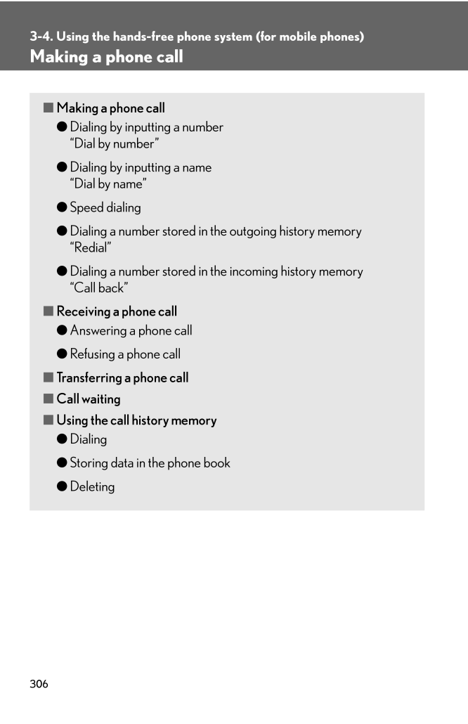 3063-4. Using the hands-free phon e system (for mobile phones)Making a phone call■Making a phone call●Dialing by inputting a number"Dial by number"●Dialing by inputting a name"Dial by name"●Speed dialing●Dialing a number stored in the outgoing history memory"Redial"●Dialing a number stored in the incoming history memory"Call back"■Receiving a phone call●Answering a phone call●Refusing a phone call■Transferring a phone call■Call waiting■Using the call history memory●Dialing●Storing data in the phone book●Deleting