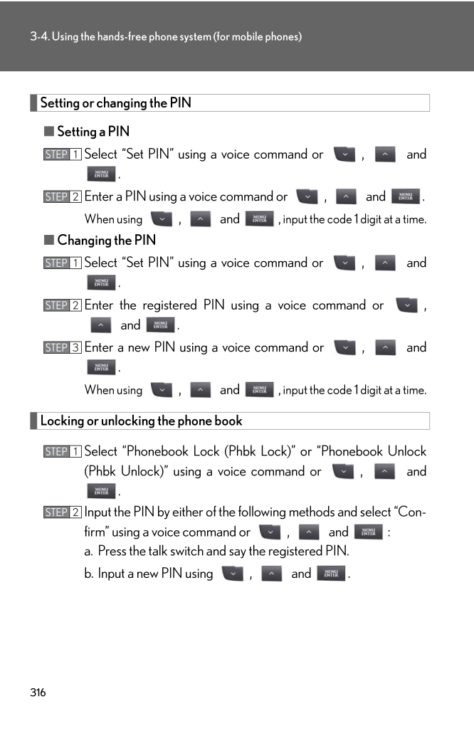 3163-4. Using the hands-free phone system (for mobile phones)Setting or changing the PIN■Setting a PINSelect "Set PIN" using a voice command or , and.Enter a PIN using a voice command or , and .When using , and , input the code 1 digit at a time.■Changing the PINSelect "Set PIN" using a voice command or , and.Enter the registered PIN using a voice command or , and .Enter a new PIN using a voice command or , and.When using , and , input the code 1 digit at a time.Locking or unlocking the phone bookSelect "Phonebook Lock (Phbk Lock)" or "Phonebook Unlock(Phbk Unlock)" using a voice command or , and.Input the PIN by either of the following methods and select "Con-firm" using a voice command or , and :a. Press the talk switch and say the registered PIN.b. Input a new PIN using , and .STEP 1STEP 2STEP 1STEP 2STEP 3STEP 1STEP 2