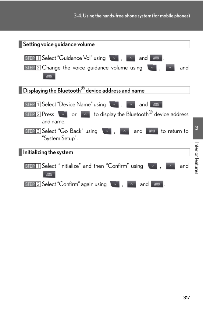 3173-4. Using the hands-free phone system (for mobile phones)3Interior featuresSetting voice guidance volumeSelect "Guidance Vol" using , and .Change the voice guidance volume using , and.Displaying the Bluetooth(R) device address and nameSelect "Device Name" using , and .Press or to display the Bluetooth(R) device addressand name.Select "Go Back" using , and to return to"System Setup".Initializing the systemSelect "Initialize" and then "Confirm" using , and.Select "Confirm" again using , and .STEP 1STEP 2STEP 1STEP 2STEP 3STEP 1STEP 2