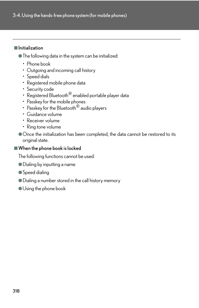 3183-4. Using the hands-free phone system (for mobile phones)■Initialization●The following data in the system can be initialized:*Phone book* Outgoing and incoming call history*Speed dials* Registered mobile phone data*Security code* Registered Bluetooth(R) enabled portable player data* Passkey for the mobile phones* Passkey for the Bluetooth(R) audio players*Guidance volume* Receiver volume* Ring tone volume●Once the initialization has been complete d, the data cannot be restored to itsoriginal state.■When the phone book is lockedThe following functions cannot be used:●Dialing by inputting a name●Speed dialing●Dialing a number stored in the call history memory●Using the phone book