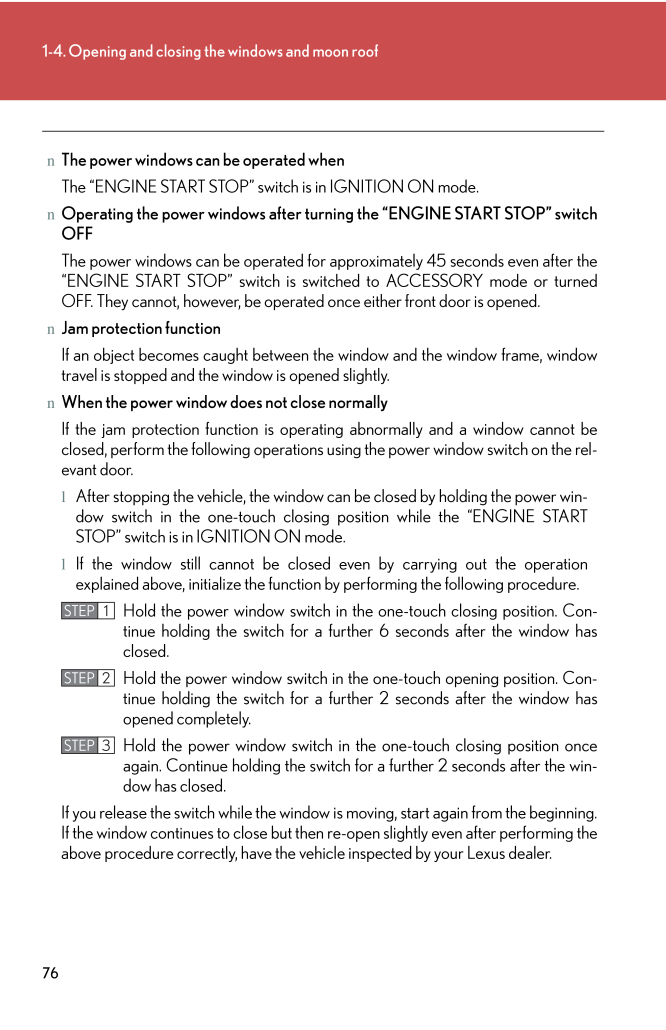 761-4. Opening and closing the windows and moon roofnThe power windows can be operated whenThe "ENGINE START STOP" switch is in IGNITION ON mode.nOperating the power windows after turning the "ENGINE START STOP" switchOFFThe power windows can be operated for ap proximately 45 seconds even after the"ENGINE START STOP" switch is switched to ACCESSORY mode or turnedOFF. They cannot, however, be operated once either front door is opened. nJam protection functionIf an object becomes caught between th e window and the window frame, windowtravel is stopped and the window is opened slightly. nWhen the power window does not close normallyIf the jam protection function is oper ating abnormally and a window cannot beclosed, perform the following operations using the power window switch on the rel-evant door.lAfter stopping the vehicle, the window can be closed by holding the power win-dow switch in the one-touch closin g position while the "ENGINE STARTSTOP" switch is in IGNITION ON mode.lIf the window still cannot be closed even by carrying out the operationexplained above, initialize the function by performing the following procedure.Hold the power window switch in the one-touch closing position. Con-tinue holding the switch for a further 6 seconds after the window hasclosed.Hold the power window switch in the one-touch opening position. Con-tinue holding the switch for a further 2 seconds after the window hasopened completely.Hold the power window switch in the one-touch closing position onceagain. Continue holding the switch for a further 2 seconds after the win-dow has closed.If you release the switch while the window is moving, start again from the beginning.If the window continues to close but then re-open slightly even after performing theabove procedure correctly, have the vehicle inspected by your Lexus dealer.STEP 1STEP 2STEP 3