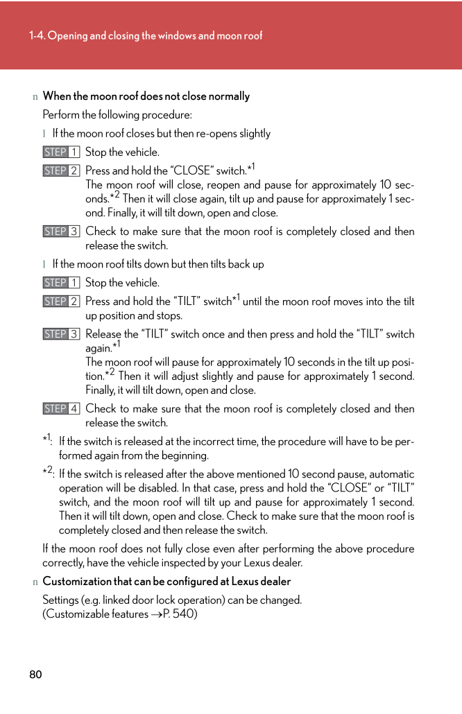 801-4. Opening and closing the windows and moon roofnWhen the moon roof does not close normallyPerform the following procedure:lIf the moon roof closes but then re-opens slightlyStop the vehicle.Press and hold the "CLOSE" switch.*1The moon roof will close, reopen and pause for approximately 10 sec-onds.*2 Then it will close again, tilt up and pause for approximately 1 sec-ond. Finally, it will tilt down, open and close.Check to make sure that the moon roof is completely closed and thenrelease the switch.lIf the moon roof tilts down but then tilts back upStop the vehicle.Press and hold the "TILT" switch*1 until the moon roof moves into the tiltup position and stops.Release the "TILT" switch once and th en press and hold the "TILT" switchagain.*1The moon roof will pause for approximately 10 seconds in the tilt up posi-tion.*2 Then it will adjust slightly and pause for approximately 1 second.Finally, it will tilt down, open and close.Check to make sure that the moon roof is completely closed and thenrelease the switch.*1: If the switch is released at the incorrect time, the procedure will have to be per-formed again from the beginning.*2: If the switch is released after the above mentioned 10 second pause, automaticoperation will be disabled. In that case, press and hold the "CLOSE" or "TILT"switch, and the moon roof will tilt up and pause for approximately 1 second.Then it will tilt down, open and close. Check to make sure that the moon roof iscompletely closed and then release the switch.If the moon roof does not fully close even after performing the above procedurecorrectly, have the vehicle inspected by your Lexus dealer.nCustomization that can be configured at Lexus dealerSettings (e.g. linked door lock operation) can be changed. (Customizable features →P. 540)STEP 1STEP 2STEP 3STEP 1STEP 2STEP 3STEP 4