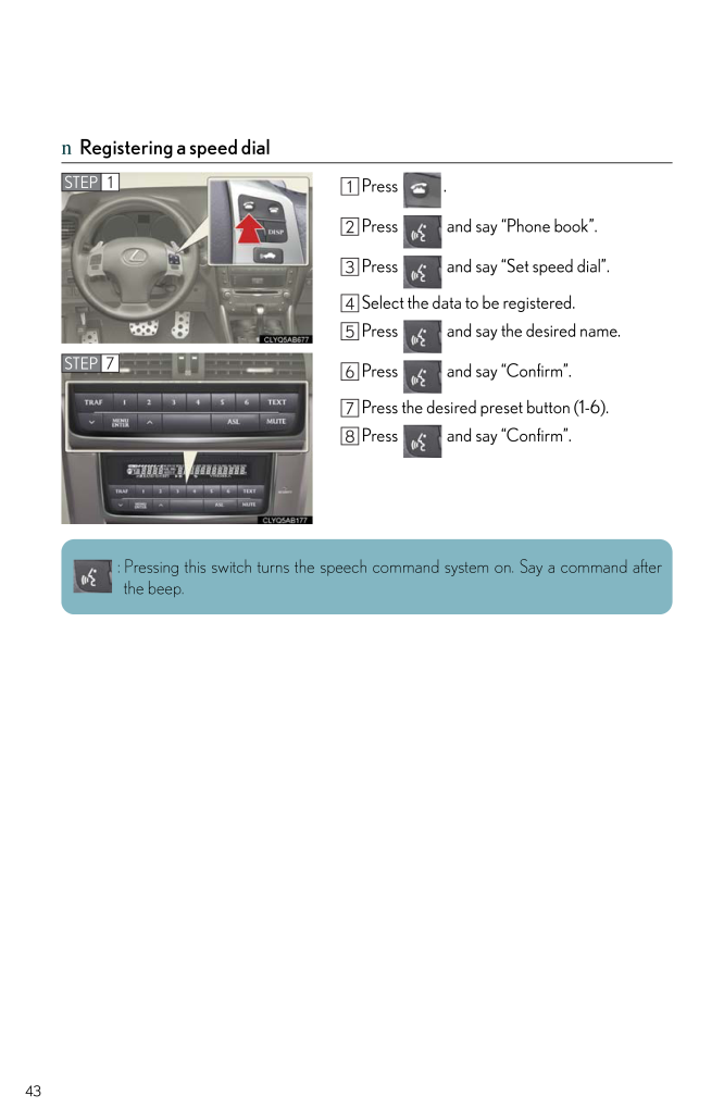 43nRegistering a speed dialPress .Press and say "Phone book".Press and say "Set speed dial".Select the data to be registered.Press and say the desired name.Press and say "Confirm".Press the desired preset button (1-6).Press and say "Confirm".STEP 1STEP 7 : Pressing this switch turns the speec h command system on. Say a command afterthe beep.