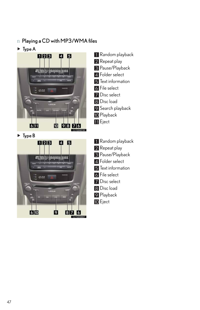 47nPlaying a CD with MP3/WMA filesType ARandom playbackRepeat playPause/PlaybackFolder selectText informationFile selectDisc selectDisc loadSearch playbackPlaybackEjectType BRandom playbackRepeat playPause/PlaybackFolder selectText informationFile selectDisc selectDisc loadPlaybackEject123456789101112345678910