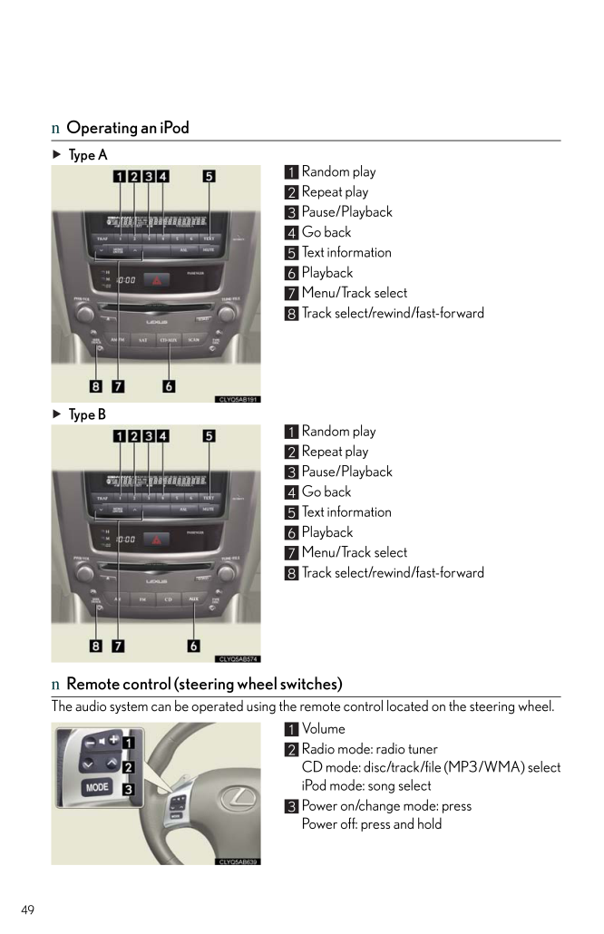 49nOperating an iPodType ARandom playRepeat playPause/PlaybackGo backText informationPlaybackMenu/Track selectTrack select/rewind/fast-forwardType BRandom playRepeat playPause/PlaybackGo backText informationPlaybackMenu/Track selectTrack select/rewind/fast-forwardnRemote control (steering wheel switches)The audio system can be operated using the remote control located on the steering wheel.VolumeRadio mode: radio tunerCD mode: disc/track/file (MP3/WMA) selectiPod mode: song selectPower on/change mode: pressPower off: press and hold1234567812345678123