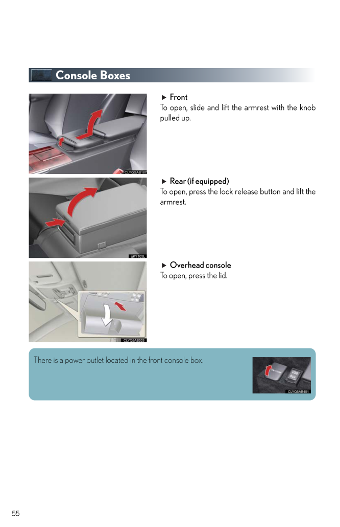 55Console BoxesFrontTo open, slide and lift the armrest with the knobpulled up.Rear (if equipped)To open, press the lock release button and lift thearmrest.Overhead consoleTo open, press the lid.There is a power outlet locate d in the front console box.