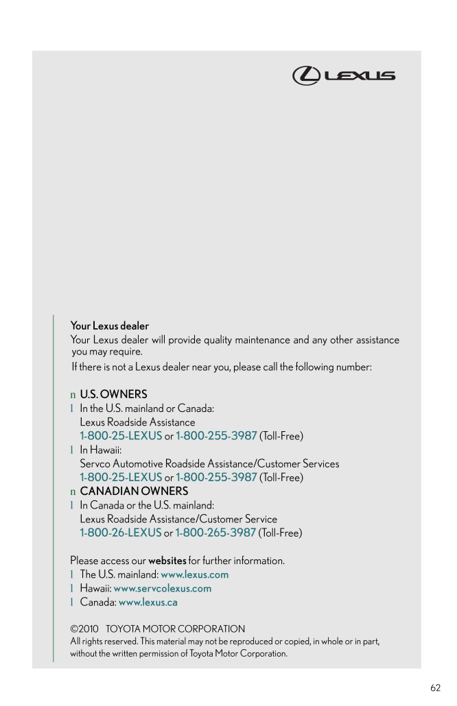 62Your Lexus dealerYour Lexus dealer will provide quality maintenance and any other assistanceyou may require.If there is not a Lexus dealer near you, please call the following number:nU.S. OWNERSlIn the U.S. mainland or Canada: Lexus Roadside Assistance 1-800-25-LEXUS or 1-800-255-3987 (Toll-Free)lIn Hawaii: Servco Automotive Roadside Assistance/Customer Services1-800-25-LEXUS or 1-800-255-3987 (Toll-Free)nCANADIAN OWNERSlIn Canada or the U.S. mainland: Lexus Roadside Assistance/Customer Service1-800-26-LEXUS or 1-800-265-3987 (Toll-Free)Please access our websites for further information.lThe U.S. mainland: www.lexus.comlHawaii: www.servcolexus.comlCanada: www.lexus.ca(C)2010 TOYOTA MOTOR CORPORATIONAll rights reserved. This material may not be reproduced or copied, in whole or in part, without the written permission of Toyota Motor Corporation.
