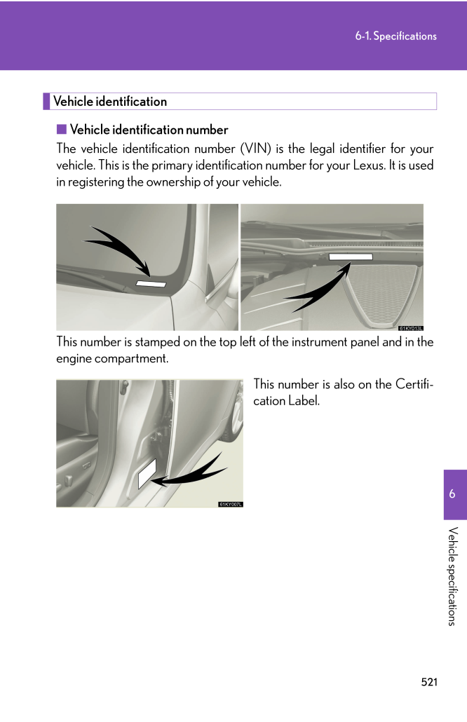 5216-1. Specifications6Vehicle specificationsVehicle identification■ Vehicle identification numberThe vehicle identification number (VIN) is the legal identifier for your vehicle. This is the primary identification number for your Lexus. It is used in registering the ownership of your vehicle.This number is stamped on the top left of the instrument panel and in the engine compartment.This number is also on the Certifi -cation Label.