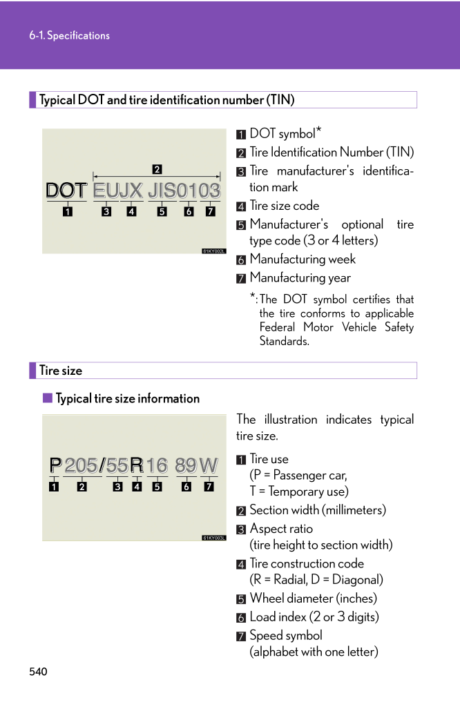 5406-1. SpecificationsTypical DOT and tire identification number (TIN)DOT symbol *Tire Identification Number (TIN)Tire manufacturer's identifica -tion markTire size codeManufacturer's optional tire type code (3 or 4 letters)Manufacturing weekManufacturing year*:The DOT symbol certifies that the tire conforms to applicable Federal Motor Vehicle Safety Standards.Tire size■ Typical tire size informationThe illustration indicates typical tire size.Tire use (P = Passenger car, T = Temporary use)Section width (millimeters)Aspect ratio (tire height to section width)Tire construction code (R = Radial, D = Diagonal)Wheel diameter (inches)Load index (2 or 3 digits)Speed symbol (alphabet with one letter)