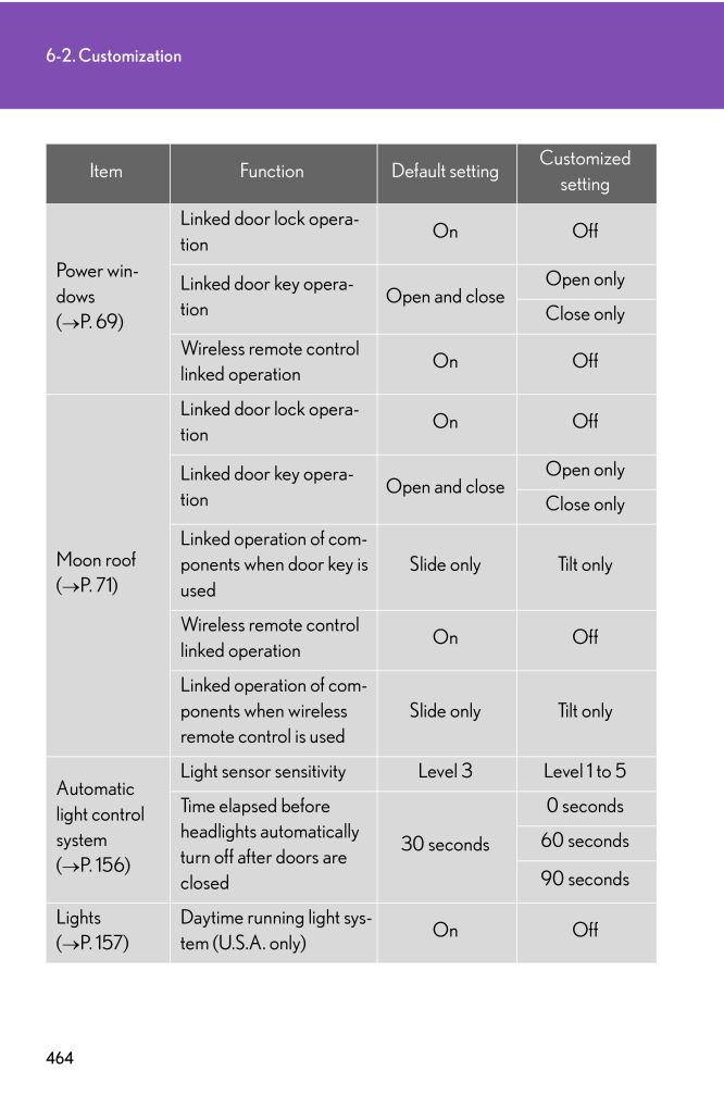4646-2. CustomizationItem Function Default settingCustomizedsettingPower win-dows (→P. 69) Linked door lock opera-tionOn OffLinked door key opera-tionOpen and closeOpen onlyClose onlyWireless remote control linked operationOn OffMoon roof(→P. 71) Linked door lock opera-tionOn OffLinked door key opera-tionOpen and closeOpen onlyClose onlyLinked operation of com-ponents when door key is usedSlide only Tilt onlyWireless remote control linked operationOn OffLinked operation of com-ponents when wireless remote control is usedSlide only Tilt onlyAutomatic light control system (→P. 156)Light sensor sensitivity Level 3 Level 1 to 5Time elapsed before headlights automatically turn off after doors are closed30 seconds0 seconds60 seconds90 secondsLights (→P. 157)Daytime running light sys-tem (U.S.A. only)On Off