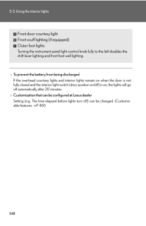 2473Interior features3-3. Using the interior lightsInterior lights listYour Lexus is equipped with the illuminated entry system to assist in enter-ing the vehicle. Owing to the function of the system, the lights shown in thefollowing illustration automatically turn on/off according to the presence ofthe electronic key, whether the doors are locked/unlocked, whether thedoors are opened/closed, and the "ENGINE START STOP" switch mode.Front personal lights (→P. 249)Front interior light (→P. 249)Front overhead courtesy lightRear personal lights (→P. 249)Rear interior lightRear overhead courtesy lightShift lever light (when "ENGIN E START STOP" switch is inACCESSORY or IGNITION ON mode)Front foot well lighting