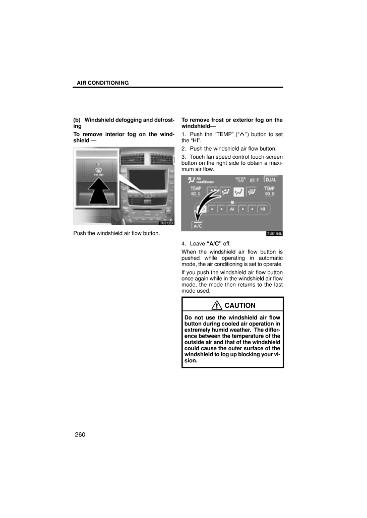 AIR CONDITIONING260(b) Windshield defogging and defrost-ingTo remove interior fog on the wind-shield -Push the windshield air flow button.To remove frost or exterior fog on thewindshield-1. Push the "TEMP" ("") button to setthe "HI".2. Push the windshield air flow button.3. Touch fan speed control touch-screenbutton on the right side to obtain a maxi-mum air flow.4. Leave "A/C" off.When the windshield air flow button ispushed while operating in automaticmode, the air conditioning is set to operate.If you push the windshield air flow buttononce again while in the windshield air flowmode, the mode then returns to the lastmode used.CAUTIONDo not use the windshield air flowbutton during cooled air operation inextremely humid w eather. The differ-ence between the temperature of theoutside air and that of the windshieldcould cause the outer surface of thewindshield to fog up bl ocking your vi-sion.