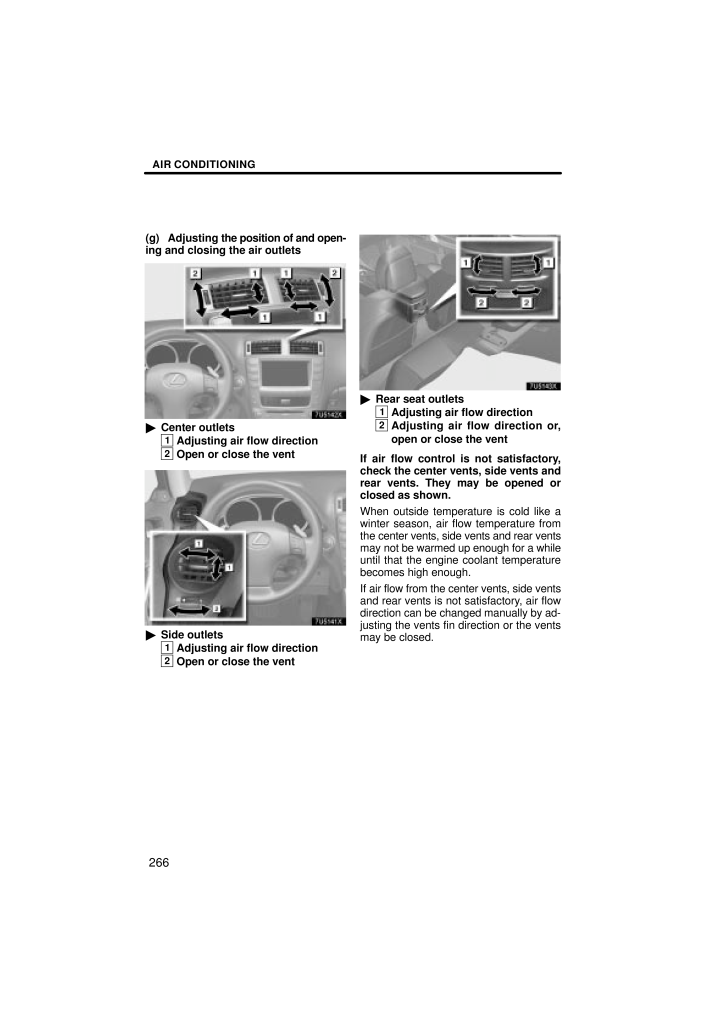 AIR CONDITIONING266(g) Adjusting the position of and open-ing and closing the air outletsCenter outlets 1Adjusting air flow direction2Open or close the ventSide outlets1Adjusting air flow direction2Open or close the ventRear seat outlets 1Adjusting air flow direction2Adjusting air flow direction or,open or close the ventIf air flow control is not satisfactory,check the center vents, side vents andrear vents. They may be opened orclosed as shown.When outside temperature is cold like awinter season, air flow temperature fromthe center vents, side vents and rear ventsmay not be warmed up enough for a whileuntil that the engine coolant temperaturebecomes high enough.If air flow from the center vents, side ventsand rear vents is not satisfactory, air flowdirection can be changed manually by ad-justing the vents fin direction or the ventsmay be closed.