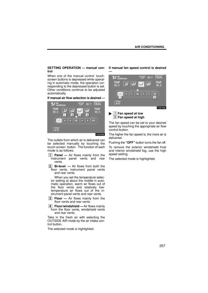 AIR CONDITIONING257SETTING OPERATION - manual con-trolWhen one of the manual control touch-screen buttons is depressed while operat-ing in automatic mode, the operation cor-responding to the depressed button is set.Other conditions continue to be adjustedautomatically.If manual air flow selection is desired -The outlets from which air is delivered canbe selected manually by touching thetouch-screen button. The function of eachmode is as follows: 1Panel - Air flows mainly from theinstrument panel vents and rearvents. 2Bi-level - Air flows from both thefloor vents, instrument panel ventsand rear vents.When you set the temperature selec-tor setting at about the middle in auto-matic operation, warm air flows out ofthe floor vents and relatively low-temperature air flows out of the in-strument panel vents and rear vents. 3Floor - Air flows mainly from thefloor vents and rear vents. 4Floor/windshield - Air flows mainlyfrom the floor vents, windshield ventsand rear vents.Take in the fresh air with selecting theOUTSIDE AIR mode by the air intake con-trol button.The selected mode is highlighted.If manual fan speed control is desired-1Fan speed at low2Fan speed at highThe fan speed can be set to your desiredspeed by touching the appropriate air flowcontrol button.The higher the fan speed is, the more air isdelivered.Pushing the "OFF" button turns the fan off.To remove the exterior windshield frostand interior windshield fog, use the highspeed setting.The selected mode is highlighted.