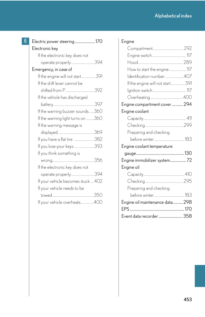 453Alphabetical indexElectric power steering.......................170Electronic keyIf the electronic key does not operate properly............................394Emergency, in case ofIf the engine will not start.................391If the shift lever cannot be shifted from P...................................392If the vehicle has discharged battery..................................................397If the warning buzzer sounds......360If the warning light turns on..........360If the warning message is displayed............................................369If you have a flat tire ........................382If you lose your keys........................393If you think something is wrong...................................................356If the electronic key does not operate properly............................394If your vehicle becomes stuck....402If your vehicle needs to be towed...................................................350If your vehicle overheats................400EngineCompartment......................................292Engine switch..........................................117Hood.......................................................289How to start the engine.....................117Identification number.......................407If the engine will not start.................391Ignition switch.........................................117Overheating........................................400Engine compartment cover.............294Engine coolantCapacity....................................................411Checking...............................................299Preparing and checking before winter.....................................183Engine coolant temperature gauge.......................................................130Engine immobilizer system..................72Engine oilCapacity..................................................410Checking...............................................295Preparing and checking before winter.....................................183Engine oil maintenance data............298EPS..............................................................170Event data recorder...........................358E