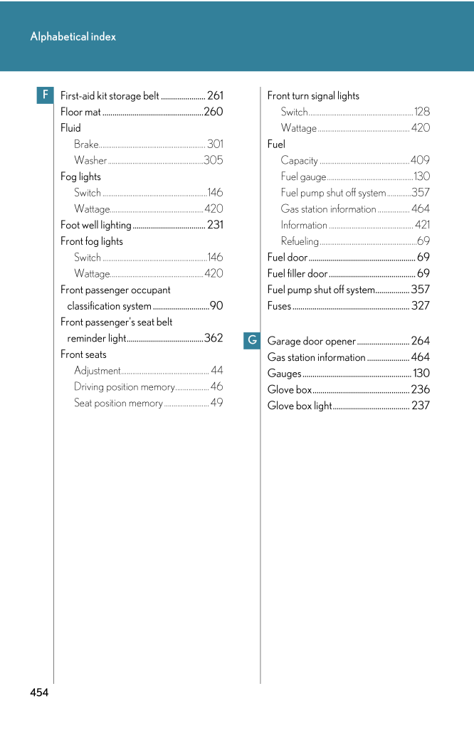 454Alphabetical indexFirst-aid kit storage belt......................261Floor mat..................................................260FluidBrake.........................................................301Washer...................................................305Fog lightsSwitch........................................................146Wattage..................................................420Foot well lighting....................................231Front fog lightsSwitch........................................................146Wattage..................................................420Front passenger occupant classification system............................90Front passenger's seat belt reminder light......................................362Front seatsAdjustment...............................................44Driving position memory..................46Seat position memory........................49Front turn signal lightsSwitch........................................................128Wattage.................................................420FuelCapacity................................................409Fuel gauge..............................................130Fuel pump shut off system.............357Gas station information.................464Information.............................................421Refueling....................................................69Fuel door.....................................................69Fuel filler door...........................................69Fuel pump shut off system.................357Fuses..........................................................327Garage door opener..........................264Gas station information.....................464Gauges......................................................130Glove box................................................236Glove box light......................................237FG