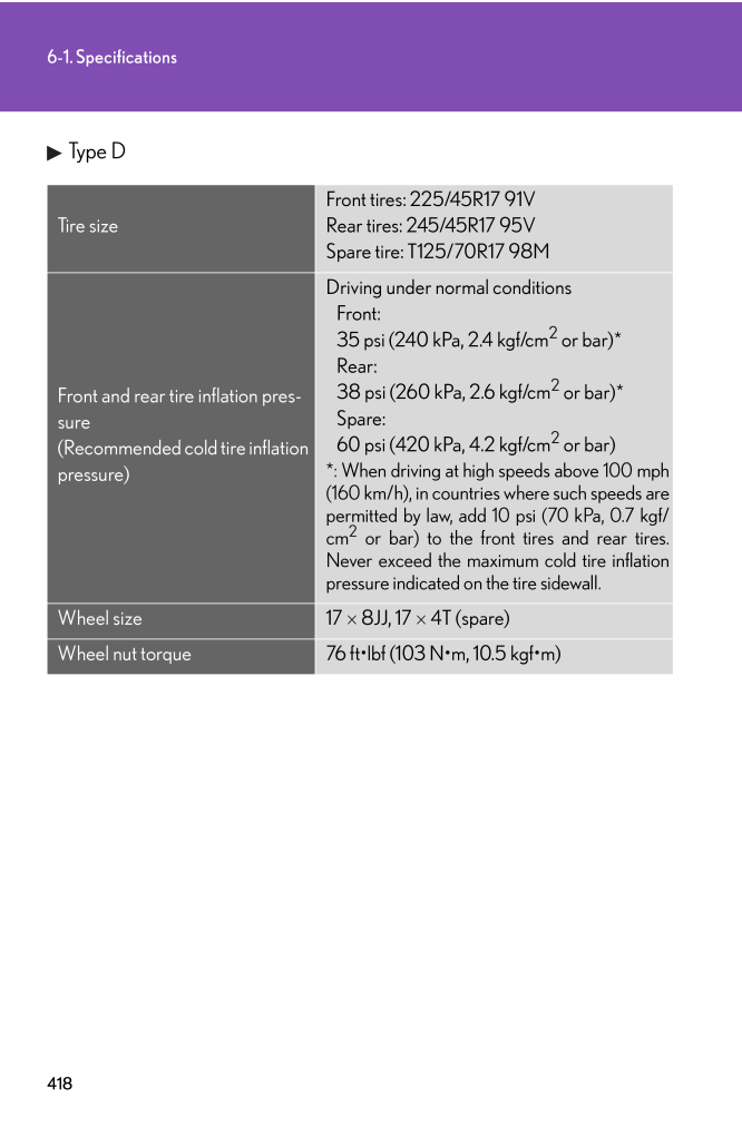 4186-1. SpecificationsType DTire sizeFront tires: 225/45R17 91VRear tires: 245/45R17 95VSpare tire: T125/70R17 98MFront and rear tire inflation pres-sure(Recommended cold tire inflation pressure)Driving under normal conditionsFront: 35 psi (240 kPa, 2.4 kgf/cm2 or bar)*Rear: 38 psi (260 kPa, 2.6 kgf/cm2 or bar)*Spare: 60 psi (420 kPa, 4.2 kgf/cm2 or bar)*: When driving at high speeds above 100 mph(160 km/h), in countries where such speeds arepermitted by law, add 10 psi (70 kPa, 0.7 kgf/cm2 or bar) to the front tires and rear tires.Never exceed the maximum cold tire inflationpressure indicated on the tire sidewall.Wheel size 17 × 8JJ, 17 × 4T (spare)Wheel nut torque 76 ft*lbf (103 N*m, 10.5 kgf*m)