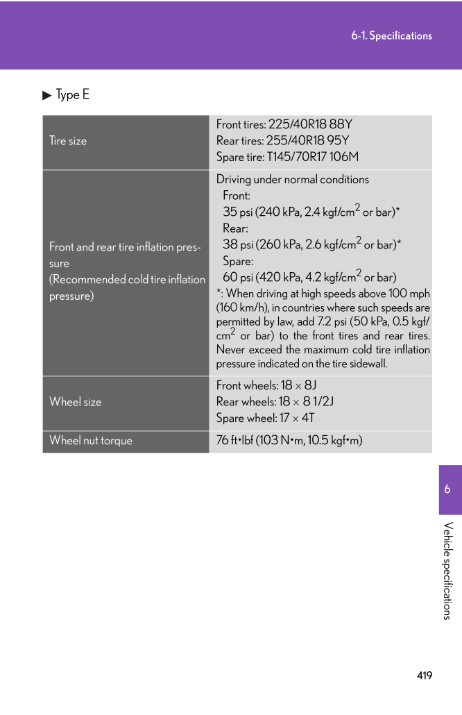 4196-1. Specifications6Vehicle specificationsType ETire sizeFront tires: 225/40R18 88YRear tires: 255/40R18 95YSpare tire: T145/70R17 106MFront and rear tire inflation pres-sure(Recommended cold tire inflation pressure)Driving under normal conditionsFront: 35 psi (240 kPa, 2.4 kgf/cm2 or bar)*Rear: 38 psi (260 kPa, 2.6 kgf/cm2 or bar)*Spare: 60 psi (420 kPa, 4.2 kgf/cm2 or bar)*: When driving at high speeds above 100 mph(160 km/h), in countries where such speeds arepermitted by law, add 7.2 psi (50 kPa, 0.5 kgf/cm2 or bar) to the front tires and rear tires.Never exceed the maximum cold tire inflationpressure indicated on the tire sidewall.Wheel sizeFront wheels: 18 × 8JRear wheels: 18 × 8 1/2JSpare wheel: 17 × 4T Wheel nut torque 76 ft*lbf (103 N*m, 10.5 kgf*m)