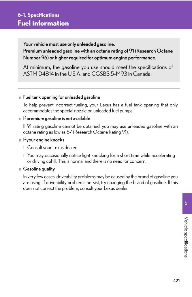 4216-1. Specifications6Vehicle specificationsFuel informationnFuel tank opening for unleaded gasolineTo help prevent incorrect fueling, your Lexus has a fuel tank opening that onlyaccommodates the special nozzle on unleaded fuel pumps.nIf premium gasoline is not availableIf 91 rating gasoline cannot be obtained, you may use unleaded gasoline with anoctane rating as low as 87 (Research Octane Rating 91).nIf your engine knockslConsult your Lexus dealer.lYou may occasionally notice light knocking for a short time while acceleratingor driving uphill. This is normal and there is no need for concern.nGasoline qualityIn very few cases, driveability problems may be caused by the brand of gasoline youare using. If driveability problems persist, try changing the brand of gasoline. If thisdoes not correct the problem, consult your Lexus dealer.Your vehicle must use only unleaded gasoline.Premium unleaded gasoline with an oc tane rating of 91 (Research OctaneNumber 96) or higher required for optimum engine performance.At minimum, the gasoline you us e should meet the specifications ofASTM D4814 in the U.S.A. and CGSB3.5-M93 in Canada.