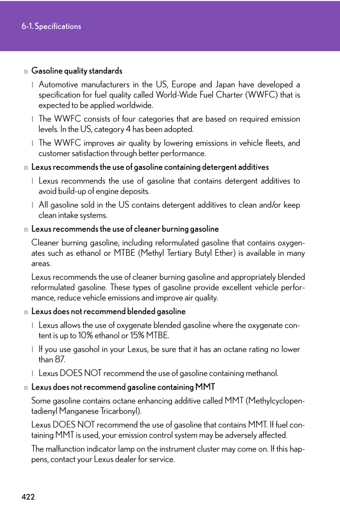 4226-1. SpecificationsnGasoline quality standardslAutomotive manufacturers in the US, Europe and Japan have developed aspecification for fuel quality called World-Wide Fuel Charter (WWFC) that isexpected to be applied worldwide.lThe WWFC consists of four categories that are based on required emissionlevels. In the US, category 4 has been adopted.lThe WWFC improves air quality by lowering emissions in vehicle fleets, andcustomer satisfaction through better performance.nLexus recommends the use of gasoline containing detergent additiveslLexus recommends the use of gasoline that contains detergent additives toavoid build-up of engine deposits.lAll gasoline sold in the US contains de tergent additives to clean and/or keepclean intake systems.nLexus recommends the use of cleaner burning gasolineCleaner burning gasoline, including reform ulated gasoline that contains oxygen-ates such as ethanol or MTBE (Methyl Tertiary Butyl Ether) is available in manyareas.Lexus recommends the use of cleaner burning gasoline and appropriately blendedreformulated gasoline. These types of gasoline provide excellent vehicle perfor-mance, reduce vehicle emissions and improve air quality.nLexus does not recommend blended gasolinelLexus allows the use of oxygenate blended gasoline where the oxygenate con-tent is up to 10% ethanol or 15% MTBE.lIf you use gasohol in your Lexus, be sure that it has an octane rating no lowerthan 87.lLexus DOES NOT recommend the use of gasoline containing methanol.nLexus does not recommend gasoline containing MMTSome gasoline contains octane enhancing additive called MMT (Methylcyclopen-tadienyl Manganese Tricarbonyl).Lexus DOES NOT recommend the use of gasoline that contains MMT. If fuel con-taining MMT is used, your emission control system may be adversely affected.The malfunction indicator lamp on the inst rument cluster may come on. If this hap-pens, contact your Lexus dealer for service.