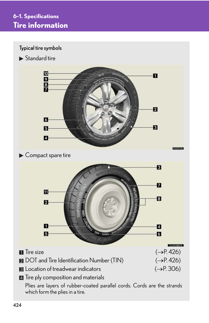 4246-1. SpecificationsTire informationTypical tire symbolsStandard tireCompact spare tireTire size (→P. 426)DOT and Tire Identification Number (TIN) ( →P. 426)Location of treadwear indicators ( →P. 306)Tire ply composition and materialsPlies are layers of rubber-coated parallel cords. Cords are the strandswhich form the plies in a tire.