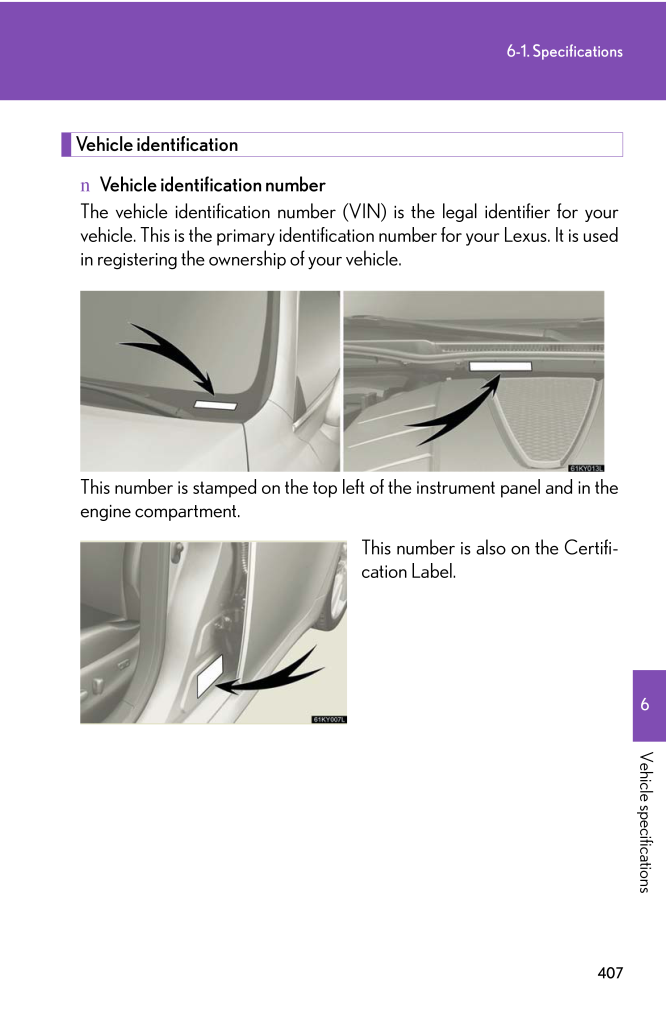 4076-1. Specifications6Vehicle specificationsVehicle identificationnVehicle identification numberThe vehicle identification number (V IN) is the legal identifier for yourvehicle. This is the primary identification number for your Lexus. It is usedin registering the ownership of your vehicle.This number is stamped on the top left of the instrument panel and in theengine compartment.This number is also on the Certifi-cation Label.