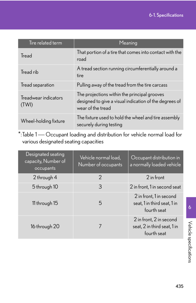 4356-1. Specifications6Vehicle specifications*:Table 1 ⎯ Occupant loading and distributi on for vehicle normal load forvarious designated seating capacitiesTire related term MeaningTreadThat portion of a tire that comes into contact with the roadTread ribA tread section running circumferentially around a tireTread separation Pulling away of the tread from the tire carcassTreadwear indicators (TWI)The projections within the principal grooves designed to give a visual indication of the degrees of wear of the treadWheel-holding fixtureThe fixture used to hold the wheel and tire assembly securely during testingDesignated seating capacity, Number of occupantsVehicle normal load, Number of occupantsOccupant distribution in a normally loaded vehicle2 through 4 2 2 in front5 through 10 3 2 in front, 1 in second seat11 through 15 52 in front, 1 in second seat, 1 in third seat, 1 in fourth seat16 through 20 72 in front, 2 in second seat, 2 in third seat, 1 in fourth seat
