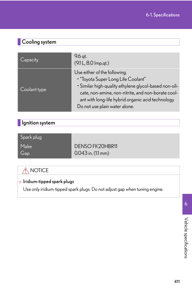 4116-1. Specifications6Vehicle specificationsCooling systemIgnition systemCapacity9.6 qt.(9.1 L, 8.0 lmp.qt.)Coolant typeUse either of the following.*"Toyota Super Long Life Coolant" *Similar high-quality ethylene glycol-based non-sili-cate, non-amine, non-nitrite, and non-borate cool-ant with long-life hybrid organic acid technologyDo not use plain water alone.Spark plugMakeGapDENSO FK20HBR110.043 in. (1.1 mm)NOTICEnIridium-tipped spark plugsUse only iridium-tipped spark plugs. Do not adjust gap when tuning engine.