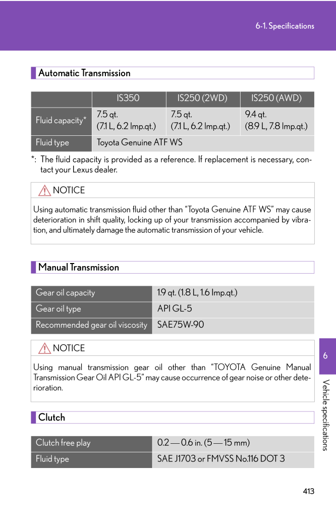 4136-1. Specifications6Vehicle specificationsAutomatic Transmission*: The fluid capacity is provided as a reference. If replacement is necessary, con-tact your Lexus dealer.Manual TransmissionClutchIS350 IS250 (2WD) IS250 (AWD)Fluid capacity*7.5 qt. (7.1 L, 6.2 lmp.qt.)7.5 qt. (7.1 L, 6.2 lmp.qt.)9.4 qt. (8.9 L, 7.8 lmp.qt.)Fluid type Toyota Genuine ATF WSNOTICEUsing automatic transmission fluid other than "Toyota Genuine ATF WS" may causedeterioration in shift quality, locking up of your transmission accompanied by vibra-tion, and ultimately damage the auto matic transmission of your vehicle.Gear oil capacity 1.9 qt. (1.8 L, 1.6 Imp.qt.)Gear oil type API GL-5Recommended gear oil viscosity SAE75W-90NOTICEUsing manual transmission gear oil other than "TOYOTA Genuine ManualTransmission Gear Oil API GL-5" may cause occurrence of gear noise or other dete-rioration.Clutch free play 0.2 ⎯ 0.6 in. (5 ⎯ 15 mm)Fluid type SAE J1703 or FMVSS No.116 DOT 3