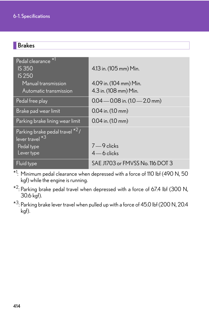 4146-1. SpecificationsBrakes*1: Minimum pedal clearance when depressed with a force of 110 lbf (490 N, 50kgf) while the engine is running.*2:Parking brake pedal travel when depressed with a force of 67.4 lbf (300 N,30.6 kgf).*3:Parking brake lever travel when pulled up with a force of 45.0 lbf (200 N, 20.4kgf).Pedal clearance *1IS 350IS 250Manual transmissionAutomatic transmission4.13 in. (105 mm) Min.4.09 in. (104 mm) Min.4.3 in. (108 mm) Min.Pedal free play 0.04 ⎯ 0.08 in. (1.0 ⎯ 2.0 mm)Brake pad wear limit 0.04 in. (1.0 mm)Parking brake lining wear limit 0.04 in. (1.0 mm)Parking brake pedal travel *2/lever travel *3Pedal typeLever type7 ⎯ 9 clicks4 ⎯ 6 clicksFluid type SAE J1703 or FMVSS No. 116 DOT 3