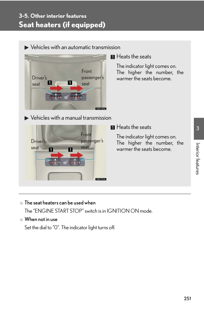 2513-5. Other interior features3Interior featuresSeat heaters (if equipped)nThe seat heaters can be used whenThe "ENGINE START STOP" switch is in IGNITION ON mode.nWhen not in useSet the dial to "0". The indicator light turns off.Vehicles with an automatic transmissionHeats the seatsThe indicator light comes on.The higher the number, thewarmer the seats become.Vehicles with a manual transmissionHeats the seatsThe indicator light comes on.The higher the number, thewarmer the seats become.Driver'sseatFront passenger'sseatDriver'sseatFront passenger'sseat