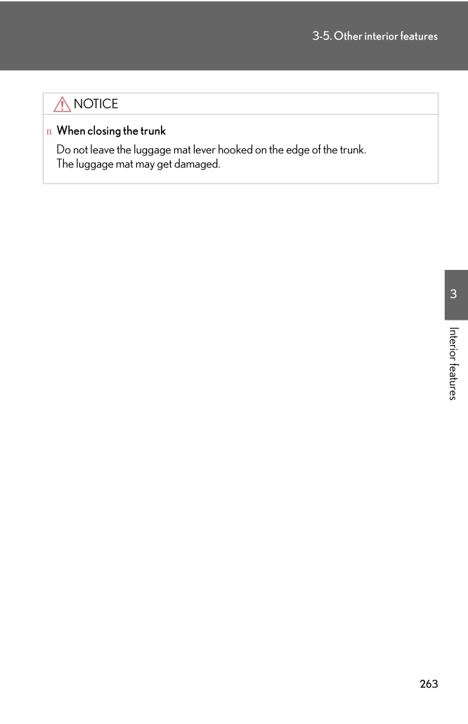 2633-5. Other interior features3Interior featuresNOTICEnWhen closing the trunkDo not leave the luggage mat lever hooked on the edge of the trunk.The luggage mat may get damaged.