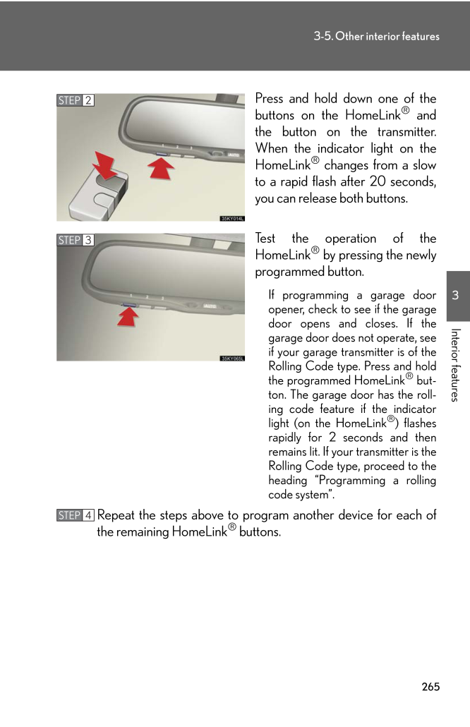 2653-5. Other interior features3Interior featuresPress and hold down one of thebuttons on the HomeLink® andthe button on the transmitter.When the indicator light on theHomeLink® changes from a slowto a rapid flash after 20 seconds,you can release both buttons.Test the operation of theHomeLink® by pressing the newlyprogrammed button.If programming a garage dooropener, check to see if the garagedoor opens and closes. If thegarage door does not operate, seeif your garage transmitter is of theRolling Code type. Press and holdthe programmed HomeLink® but-ton. The garage door has the roll-ing code feature if the indicatorlight (on the HomeLink®) flashesrapidly for 2 seconds and thenremains lit. If your transmitter is theRolling Code type, proceed to theheading "Programming a rollingcode system".Repeat the steps above to program another device for each ofthe remaining HomeLink® buttons.STEP 2STEP 3STEP 4