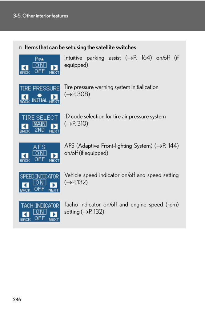 2463-5. Other interior featuresnItems that can be set using the satellite switchesIntuitive parking assist (→P. 164) on/off (ifequipped)Tire pressure warning system initialization (→P. 308)ID code selection for tire air pressure system (→P. 310)AFS (Adaptive Front-lighting System) ( →P. 144)on/off (if equipped)Vehicle speed indicator on/off and speed setting(→P. 132)Tacho indicator on/off and engine speed (rpm)setting (→P. 132)