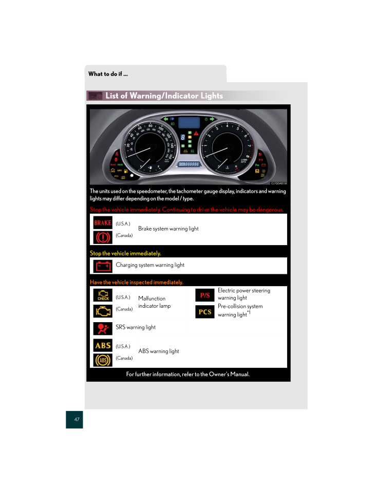 What to do if ...47List of Warning/Indicator LightsThe units used on the speedomet er, the tachometer gauge disp lay, indicators and warninglights may differ depending on the model / type.Stop the vehicle immediately. Continuing to drive the vehicle may be dangerous.(U.S.A.)(Canada)Brake system warning light Stop the vehicle immediately.Charging system warning lightHave the vehicle inspected immediately.(U.S.A.)(Canada)Malfunction indicator lampElectric power steering warning lightPre-collision system warning light*1SRS warning light(U.S.A.)(Canada)ABS warning lightFor further information, re fer to the Owner's Manual.53650U_IS_01.book Page 47 Friday, August 17, 2007 9:38 AM
