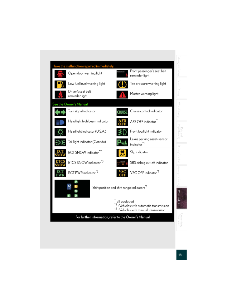 48Entering and ExitingBefore DrivingWhen DrivingRain and Night DrivingDriving ComfortOpening and ClosingWhat to do if ...CustomizingYour LexusHave the malfunction repaired immediately.Open door warning lightFront passenger's seat belt reminder lightLow fuel level warning light Tire pressure warning lightaDriver's seat beltreminder lightMaster warning light See the Owner's ManualTurn signal indicator Cruise control indicatorHeadlight high beam indicatorAFS OFF indicator*1Headlight indicator (U.S.A.) Front fog light indicatorTail light indicator (Canada)Lexus parking assist-sensor indicator*1ECT SNOW indicator*2Slip indicatorETCS SNOW indicator*3SRS airbag cut-off indicatorECT PWR indicator*2VSC OFF indicator*1Shift position and shift range indicators*1*1 : If equipped*2 : Vehicles with automatic transmission*3 : Vehicles with manual transmissionFor further information, re fer to the Owner's Manual.53650U_IS_01.book Page 48 Friday, August 17, 2007 9:38 AM