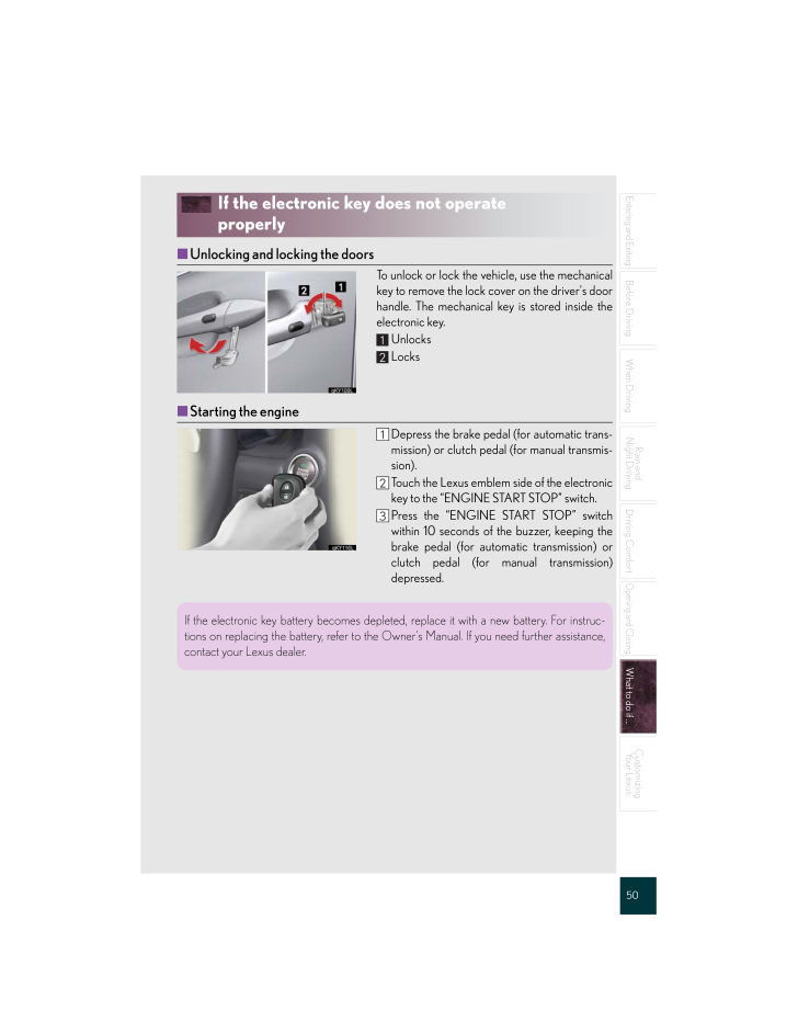 50Entering and ExitingBefore DrivingWhen DrivingRain and Night DrivingDriving ComfortOpening and ClosingWhat to do if ...CustomizingYour LexusIf the electronic key does not operate properlynUnlocking and locking the doorsTo unlock or lock the vehicle, use the mechanicalkey to remove the lock cover on the driver's doorhandle. The mechanical key is stored inside theelectronic key.UnlocksLocksnStarting the engineDepress the brake pedal (for automatic trans-mission) or clutch pedal (for manual transmis-sion).Touch the Lexus emblem side of the electronickey to the "ENGINE START STOP" switch.Press the "ENGINE START STOP" switchwithin 10 seconds of the buzzer, keeping thebrake pedal (for automatic transmission) orclutch pedal (for manual transmission)depressed.12If the electronic key battery becomes depleted , replace it with a new battery. For instruc-tions on replacing the battery, refer to the Ow ner's Manual. If you need further assistance,contact your Lexus dealer.53650U_IS_01.book Page 50 Friday, August 17, 2007 9:38 AM