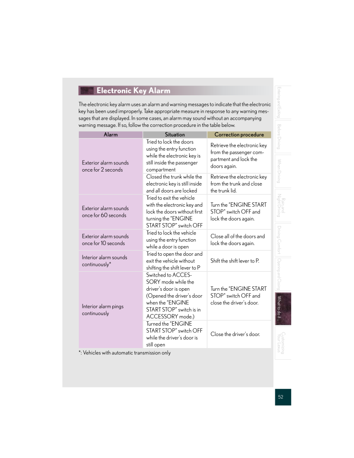 52Entering and ExitingBefore DrivingWhen DrivingRain and Night DrivingDriving ComfortOpening and ClosingWhat to do if ...CustomizingYour LexusElectronic Key AlarmThe electronic key alarm uses an alarm and warn ing messages to indicate that the electronic key has been used improperly. Take appropri ate measure in response to any warning mes-sages that are displayed. In some cases, an alarm may sound without an accompanying warning message. If so, follow the co rrection procedure in the table below.*: Vehicles with automatic transmission onlyAlarm Situation Correction procedureExterior alarm sounds once for 2 secondsTried to lock the doors using the entry function while the electronic key is still inside the passenger compartmentRetrieve the electronic key from the passenger com-partment and lock the doors again.Closed the trunk while the electronic key is still inside and all doors are lockedRetrieve the electronic key from the trunk and close the trunk lid.Exterior alarm sounds once for 60 secondsTried to exit the vehicle with the electronic key and lock the doors without first turning the "ENGINE START STOP" switch OFFTurn the "ENGINE START STOP" switch OFF and lock the doors again.Exterior alarm sounds once for 10 secondsTried to lock the vehicle using the entry function while a door is openClose all of the doors and lock the doors again.Interior alarm sounds continuously*Tried to open the door and exit the vehicle without shifting the shift lever to PShift the shift lever to P.Interior alarm pings continuouslySwitched to ACCES-SORY mode while the driver's door is open (Opened the driver's door when the "ENGINE START STOP" switch is in ACCESSORY mode.)Turn the "ENGINE START STOP" switch OFF and close the driver's door.Turned the "ENGINE START STOP" switch OFF while the driver's door is still openClose the driver's door.53650U_IS_01.book Page 52 Friday, August 17, 2007 9:38 AM
