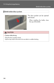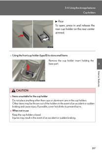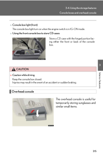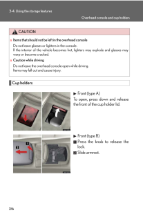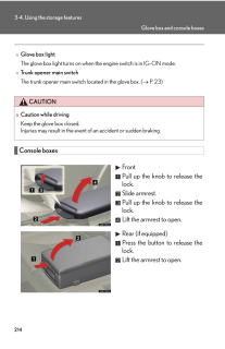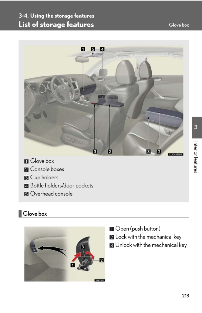 2133Interior features3-4. Using the storage featuresList of storage featuresGlove boxOpen (push button)Lock with the mechanical keyUnlock with the mechanical keyGlove boxConsole boxesCup holdersBottle holders/door pocketsOverhead consoleGlove box