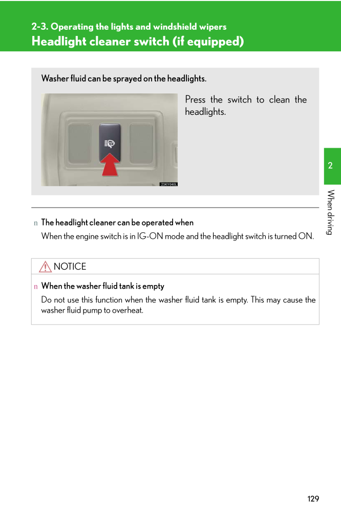 1292-3. Operating the lights and windshield wipers2When drivingHeadlight cleaner switch (if equipped)nThe headlight cleaner can be operated whenWhen the engine switch is in IG-ON mode and the headlight switch is turned ON.NOTICEnWhen the washer fluid tank is emptyDo not use this function when the washer fluid tank is empty. This may cause thewasher fluid pump to overheat.Washer fluid can be sprayed on the headlights.Press the switch to clean theheadlights.
