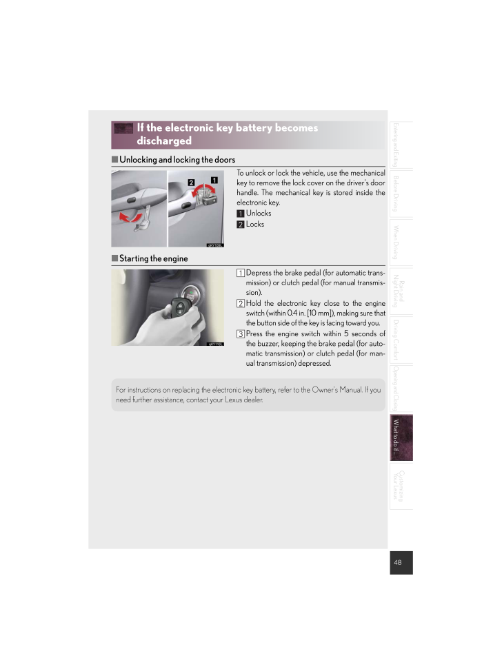 48Entering and ExitingBefore DrivingWhen DrivingRain and Night DrivingDriving ComfortOpening and ClosingWhat to do if ...CustomizingYour LexusIf the electronic key battery becomes dischargednUnlocking and locking the doorsTo unlock or lock the vehicle, use the mechanicalkey to remove the lock cover on the driver's doorhandle. The mechanical key is stored inside theelectronic key.UnlocksLocksnStarting the engineDepress the brake pedal (for automatic trans-mission) or clutch pedal (for manual transmis-sion).Hold the electronic key close to the engineswitch (within 0.4 in. [10 mm]), making sure thatthe button side of the key is facing toward you. Press the engine switch within 5 seconds ofthe buzzer, keeping the brake pedal (for auto-matic transmission) or clutch pedal (for man-ual transmission) depressed.12For instructions on replacing the electronic key battery, refer to the Owner's Manual. If youneed further assistance, contact your Lexus dealer.53588U_IS_01.book Page 48 Monday, July 24, 2006 4:56 PM
