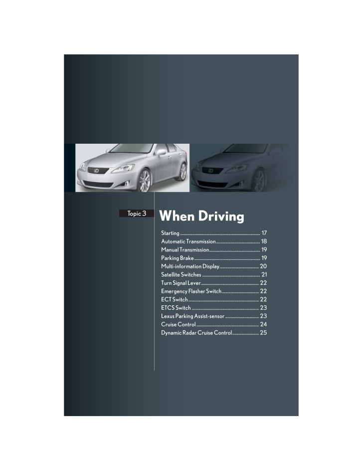 When DrivingTopic 3Starting..................................................................... 17Automatic Transmission...................................... 18Manual Transmission............................................ 19Parking Brake......................................................... 19Multi-information Display.................................. 20Satellite Switches.................................................. 21Turn Signal Lever.................................................. 22Emergency Flasher Switch................................ 22ECT Switch............................................................. 22ETCS Switch.......................................................... 23Lexus Parking Assist-sensor............................. 23Cruise Control...................................................... 24Dynamic Radar Cruise Control....................... 2553588U_IS_01.book Page 16 Monday, July 24, 2006 4:56 PM