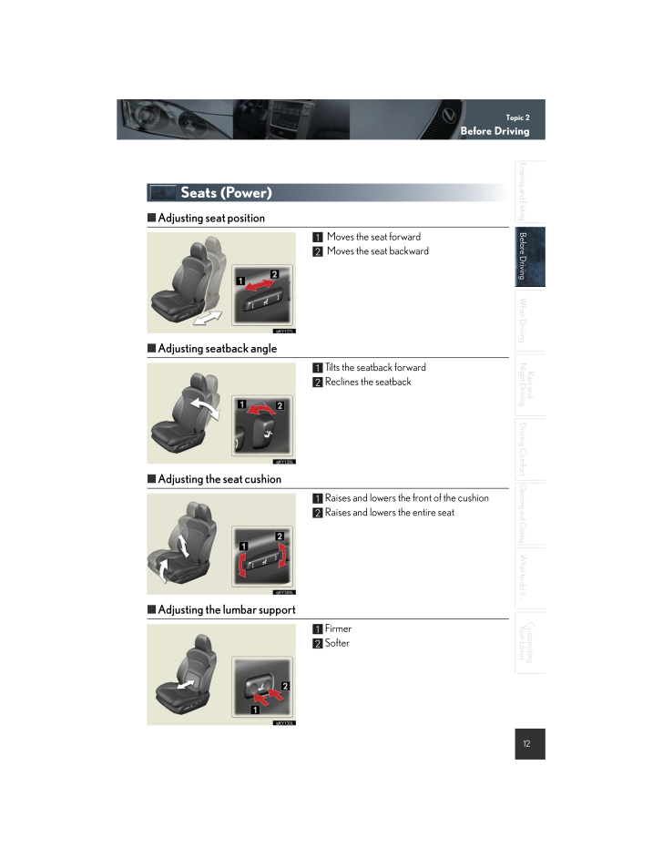 Topic 2Before Driving12Entering and ExitingBefore DrivingWhen DrivingRain and Night DrivingDriving ComfortOpening and ClosingWhat to do if ...CustomizingYour LexusSeats (Power)nAdjusting seat position Moves the seat forward Moves the seat backwardnAdjusting seatback angleTilts the seatback forwardReclines the seatbacknAdjusting the seat cushionRaises and lowers the front of the cushionRaises and lowers the entire seatnAdjusting the lumbar supportFirmerSofter1212121253588U_IS_01.book Page 12 Monday, July 24, 2006 4:56 PM